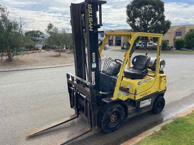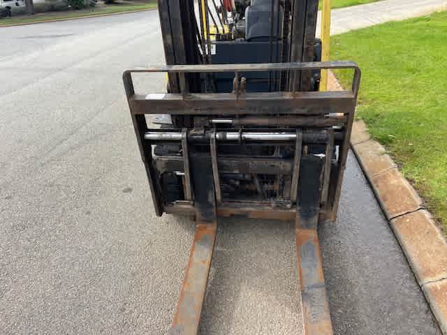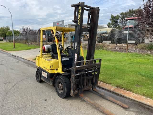 Chariot élévateur Hyster 2,5 tonnes gaz 2012 1388 heures Positionnement des fourches Déplacement latéral.