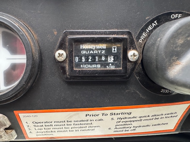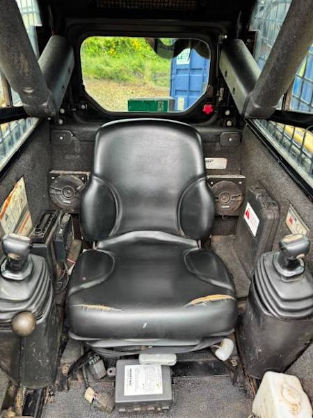Modèle 2017, 5216 heures, 60 CV, turbocompressé, machine de 2960 kg, capacité de levage de 862 kg, déplacement à deux vitesses, commande par joystick, godet 4-en-1 de 1720 mm de large, cabine climatisée, stéréo AM/FM, radio UHF.